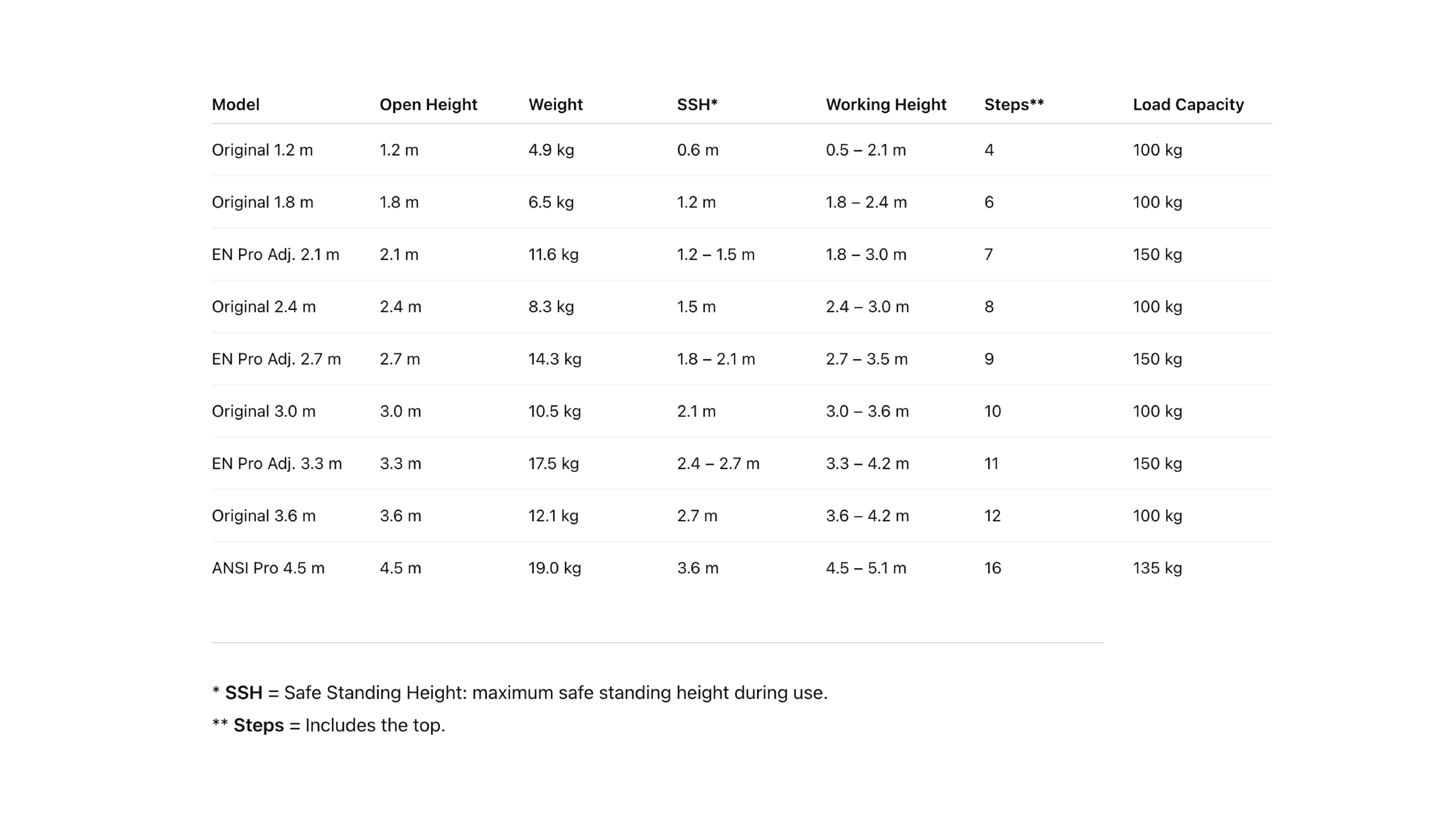 Consultez toutes les caractéristiques techniques de nos échelles à trépied Hasegawa. De la hauteur de travail à la capacité de charge : tout ce que vous devez savoir en un seul coup d'œil.